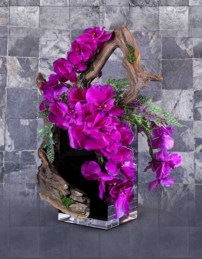 Obra de arte con base de madera en forma rectangular que se extiende hacia arriba con un toque de elegancia y sofisticación, forrada en la mejor selección de tapiz, un toque de acrílico negro brillante en conjunto con un acrílico transparente en la base inferior. En la parte superior se encuentra un tronco natural tratado, orquídeas de alta gama y elementos decorativos artificiales finamente seleccionados a gusto del artista.