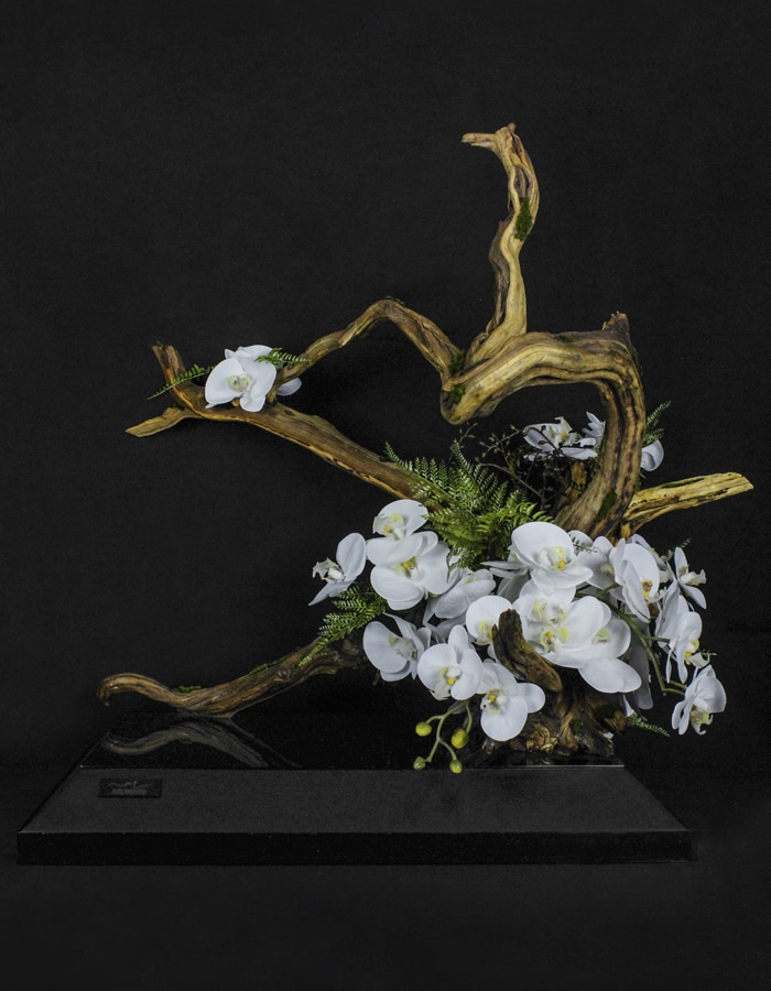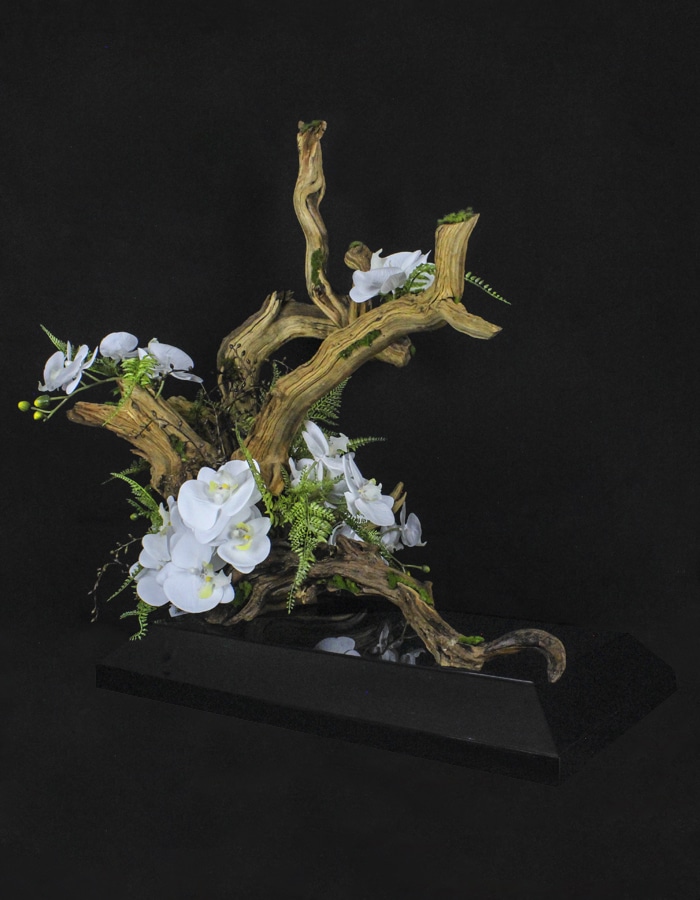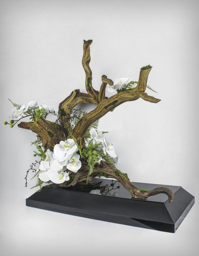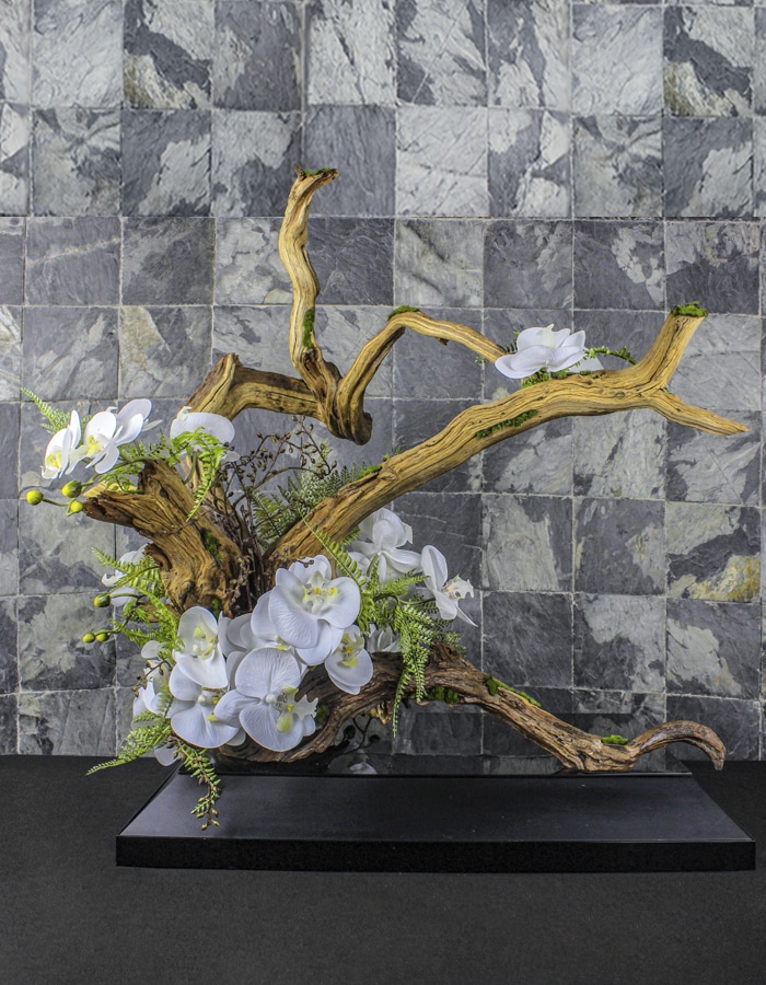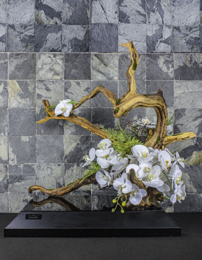 Obra de arte con base de madera en forma piramidal forrada con una especial combinación de acrílico negro de alto brillo y tapiz de alta gama. Dicha base hace resaltar la belleza del tronco natural que da la sensación de estar suspendido en parte superior de la pieza, esto en conjunto con orquídeas y elementos decorativos artificiales finamente seleccionados a gusto del artista, conjugan una obra de arte irrepetible.