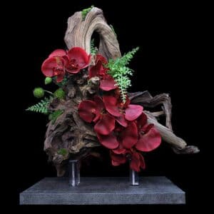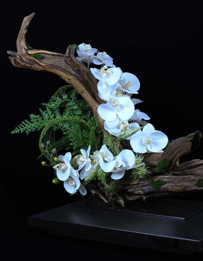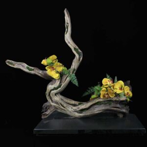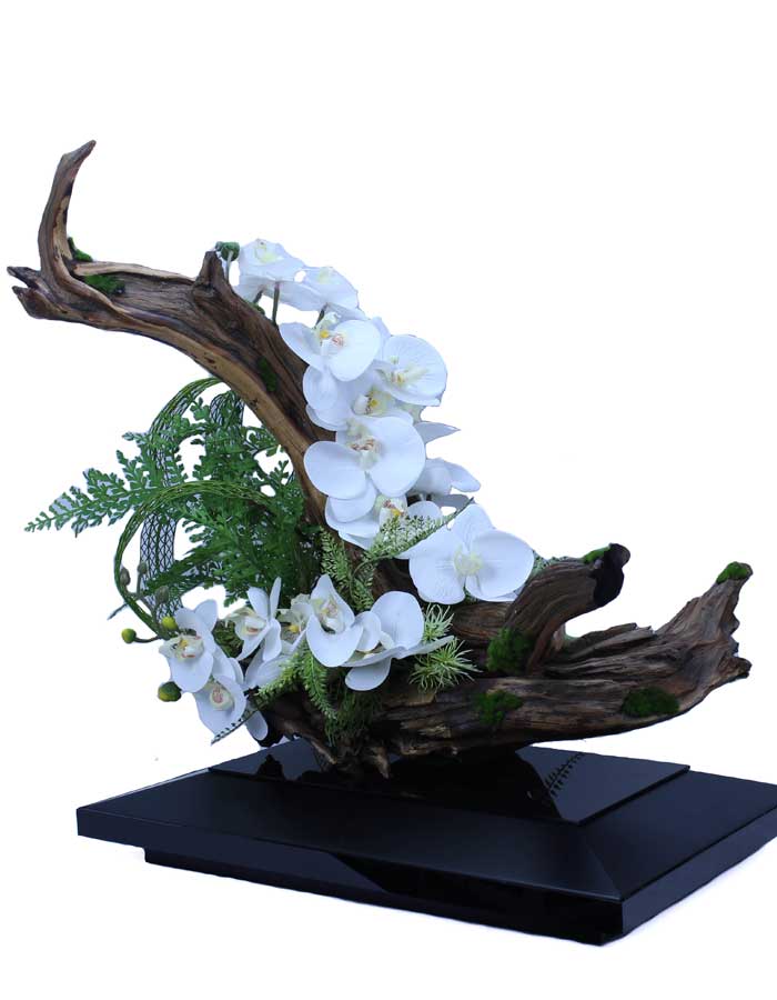 Obra de arte con base de madera en forma piramidal forrada con una especial combinación de acrílico negro de alto brillo y tapiz de alta gama. Dicha base hace resaltar la belleza del tronco natural que da la sensación de estar suspendido en parte superior de la pieza, esto en conjunto con orquídeas y elementos decorativos artificiales finamente seleccionados a gusto del artista, conjugan una obra de arte irrepetible.